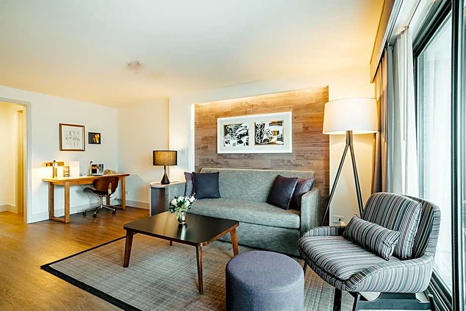 This suite features a private balcony with city views, a spacious seating area with a sofa bed and a bathroom with marble floors. Floor-to-ceiling glass doors, a gourmet coffee maker and a walk-in closet are also included.